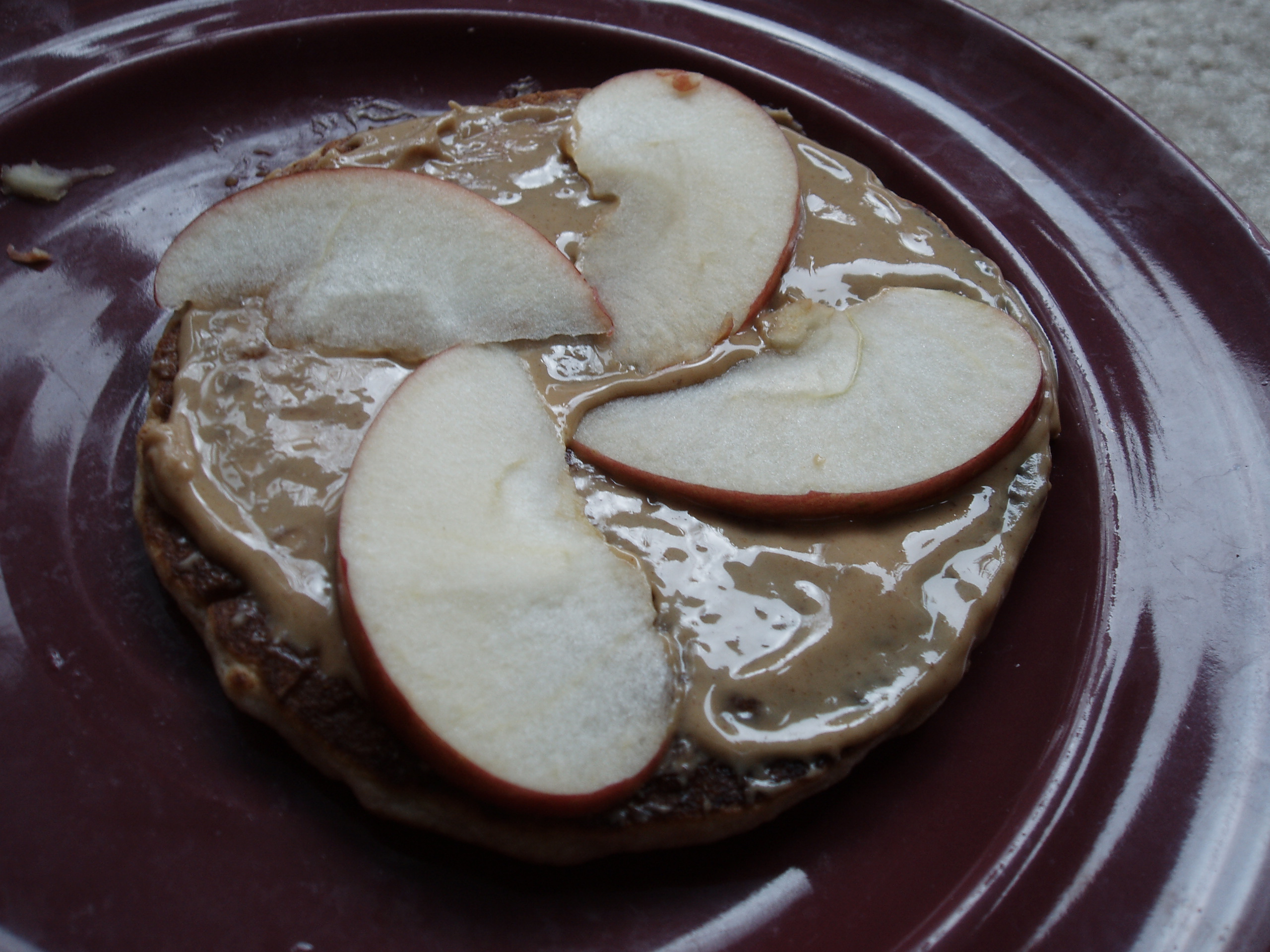 Introducing: Apple Peanut Butter Pancakes. Heat a frozen pancake for 30 seconds, spread with peanut butter, top with thinly sliced apples. The peanut butter melts to a wonderful, creamy, gooey, yummy consistency. Olivia ate one; I ate two.