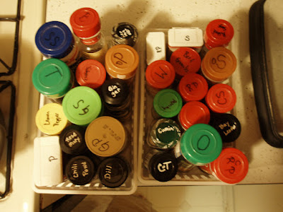 My spice organizationage has vastly improved. See? A label on every cap.