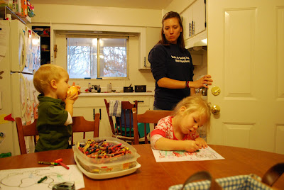 Benjamin’s snacking on an apple while his sister works diligently on her “Ee” coloring page and I look like I’m in the middle of saying “Wow, Olivia, great job!” as I head out the door into the garage to do something laundry-related.