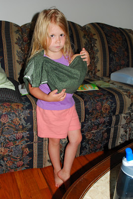 A baby doll sling! It was so easy, took no more than 15 minutes. And she loved it! Especially since she sees me wear Levi all the time these days. 🙂